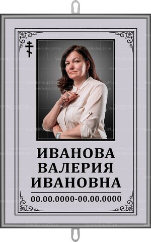 Табличка для крепления на крест с крупным изображением покойного. Размер: 25х36 см. Под портретом написаны черными буквами на сером фоне фамилия, имя и отчество и годы жизни арабскими цифрами. В верхнем левом углу нанесено изображение православного креста. Обрамление из орнаментальной виньетки. Устойчива к осадкам и выгоранию на солнце.