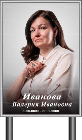 Ритуальная табличка с большим фото на ножках. Используется как временное надгробие или в качестве дополнения к памятнику или кресту. Размер без ножек: 60х40 см. Изображение покойного на сером фоне. Печатается стойкими красками, способными сохраняться под солнечными лучами.