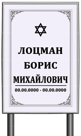 Используется в качестве временного надгробия. Ножки-трубки втыкаются в землю. Размер без ножек: 60х40 см. Высота ножек 60 см. Минималистичный дизайн: серый фон и черные буквы. Над ФИО покойного размещается изображение Звезды Давида. По краям декоративная рамка. Изготавливается из прочного и долговечного материала, устойчивого к перепадам температур и влажности.