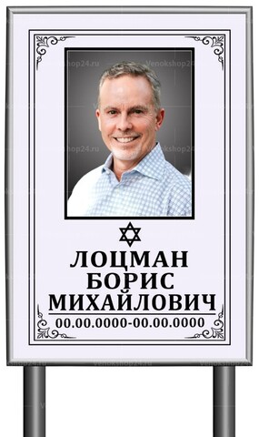 Табличка-памятник с фото используется в качестве временного надгробия. Ножки-трубки втыкаются в землю. Размер без ножек: 60х40 см. Длина ножек 60 см. Серый фон и черные буквы, изображение Звезды Давида, по краям — декоративная рамка. Печатается красками, устойчивыми к выцветанию.