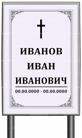 Используется в качестве временного надгробия или как дополнение к кресту. Ножки-трубки втыкаются в землю. Размер без ножек: 60х40 см. Высота ножек 60 см. Минималистичный дизайн: серый фон и черные буквы. Над ФИО покойного размещается изображение католического креста. По краям декоративная рамка. Производится из морозоустойчивого материала.