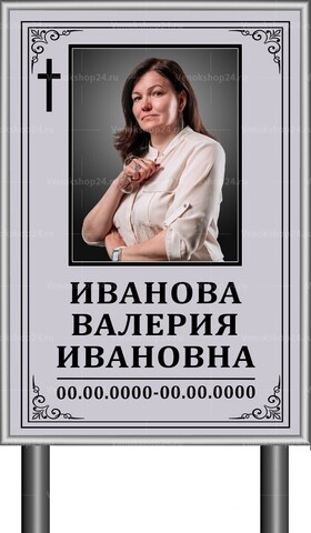 Табличка-памятник с фото используется в качестве временного надгробия или как дополнение к кресту. Ножки-трубки втыкаются в землю. Размер без ножек: 60х40 см. Длина ножек 60 см. Серый фон и черные буквы. В левом верхнем углу размещается изображение католического креста, по краям — декоративная виньетка. Производится из влагостойкого материала, который выдерживает осадки.