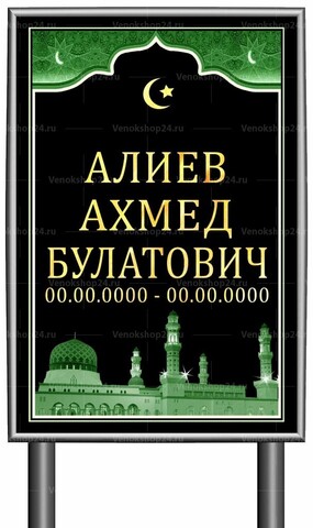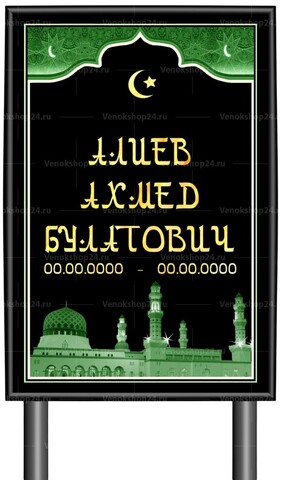 Табличка-памятник используется в качестве временного надгробия. Ножки-трубки втыкаются в землю. Размер без ножек: 60х40 см. Высота ножек 60 см. Текст написан шрифтом в арабском стиле. Фон черного цвета, изображение полумесяца, мечети и минарета. Производится из материала, устойчивого к УФ-лучам, перепадам температур и осадкам.
