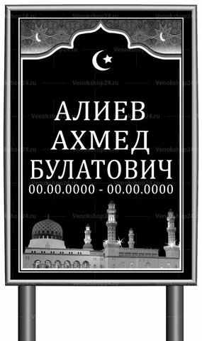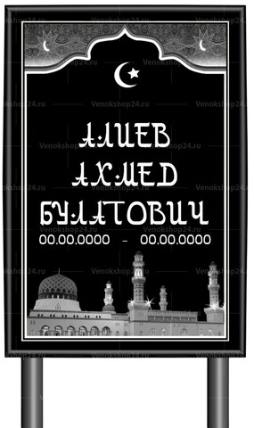 Используется в качестве временного надгробия. Ножки-трубки втыкаются в землю. Размер без ножек: 60х40 см. Высота ножек 60 см. Фон черного цвета, изображение полумесяца, мечети и минарета. Морозостойкий материал.
