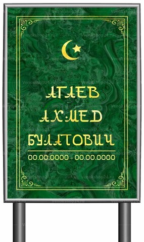 Табличка-памятник используется в качестве временного надгробия. Ножки-трубки втыкаются в землю. Размер без ножек: 60х40 см. Высота ножек 60 см. Минималистичный дизайн: фон зеленого цвета, изображение полумесяца со звездой над именем усопшего. Изготавливается из материала, который выдерживает перепады температур и осадки.