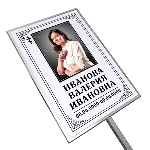 Большая православная табличка на ножке с портретом покойного. Серый фон, черные буквы. Фото усопшего в центре. В левом верхнем углу размещен православный крест. Декоративная рамка. Размер без ножки: 36х25 см. Устойчива к выгоранию под солнечными лучами и осадкам.