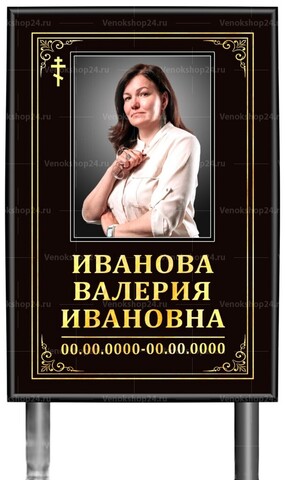 Табличка-памятник с фото используется в качестве временного надгробия или как дополнение к кресту. Ножки-трубки втыкаются в землю. Размер без ножек: 60х40 см. Высота ножек 60 см. Черный фон и золотые буквы. В левом верхнем углу размещается изображение православного креста, по краям — обрамление из декоративной рамки. Изготавливается из долговечного материала, стойкого к осадкам и морозам.