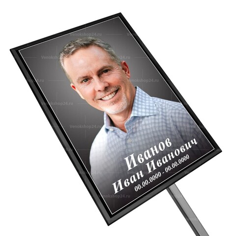 Ритуальная табличка на ножке с большеформатным портретом усопшего на черном фоне. Надпись белыми буквами. Размер без ножки: 36х25 см. Устойчива к дождю и снегу, не выгорает на солнце.