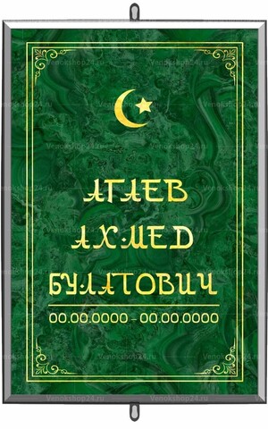 Исламская ритуальная табличка на памятник с зеленым фоном. Размер: 36х25 см. Текст написан золотыми буквами шрифтом в арабском стиле. Нанесен символ полумесяца и изображение мусульманской мечети с минаретом. Производится из долговечного материала.