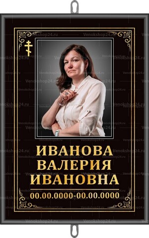 Ритуальная табличка с крупным изображением покойного. Размер: 25х36 см. Под портретом написаны золотыми буквами на черном фоне фамилия, имя и отчество и годы жизни арабскими цифрами. В верхнем левом углу нанесено изображение православного креста. Обрамление из орнаментальной виньетки. Изготавливается из прочного материала, устойчивого к перепадам температур и влажности.