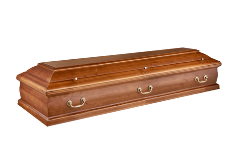 Гроб на похороны выполнен из массива сосны, затонированного в светло-коричневый оттенок и покрытого матовым лаком. Используемая древесина проходит специальную обработку в сушильне для придания ей дополнительной прочности. Изделие имеет классический дизайн. Строгая прямоугольная основа корпуса продолжается округлыми боковинами, на которых зафиксированы шесть золотистых фигурных ручек. Крышка имеет ступенчатую форму с плоской поверхностью. Крепление крышки осуществляется шестью зажимами на винтах с золотистыми навершиями в тон ручкам. Поверхность изнутри обита светлой материей. Изготовлено в России.