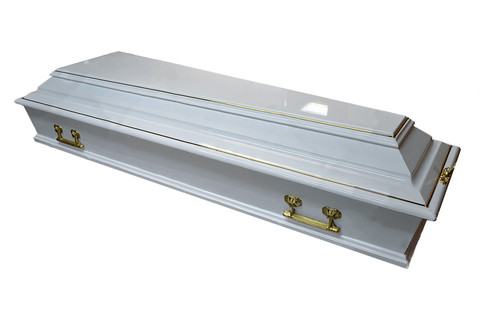 Белый гроб с глянцевым покрытием выполнен из массива сосны и украшен кантом золотого цвета по периметру верхней плоскости, также кант идет вдоль основания крышки. Крышка фиксируется на двух специальных зажимах на винтах. Изящность изделию придают суженные книзу бока четырехугольного корпуса и позолоченные ручки. Изнутри обит качественной тканью и имеет функциональный подъем для головы. Производство находится в России.