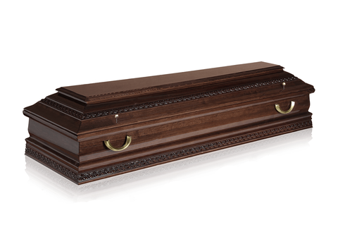 Гроб на похороны из сосны многолетней высушки изготовлен на российском производстве. На прямоугольном основании расположились фигурные стенки корпуса отделанные галтелями. Изящный декор в технике резьбы по дереву опоясывает низ корпуса и крышку. На сдержанном тёмно-коричневом фоне лакового покрытия выигрышно смотрятся золотые металлические элементы: ручки и зажимы крышки. Внутренняя отделка выполнена тканью светлого тона.