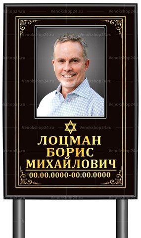 Табличка-памятник с фото используется в качестве временного надгробия. Ножки-трубки втыкаются в землю. Размер без ножек: 60х40 см. Длина ножек 60 см. Черный фон и золотые буквы, изображение Звезды Давида, по краям — декоративная рамка. Высокопрочный материал.
