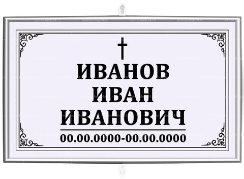 Табличка на могилу в алюминиевой рамке и обрамлении декоративной виньетки. Размер: 30х18 см. Текст черными буквами на сером фоне. Над фамилией, именем и отчеством усопшего нанесено изображение католического креста. Под чертой указываются годы жизни усопшего арабскими цифрами в формате ДД.ММ.ГГГГ.
