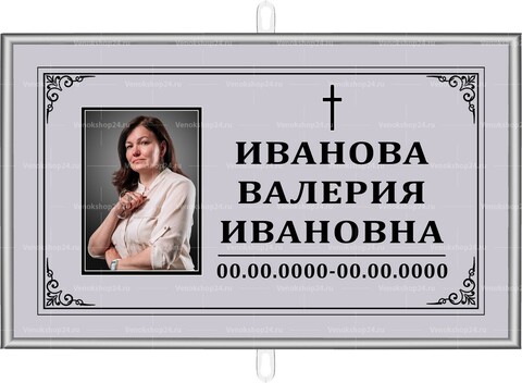Табличка для крепления на крест с католической символикой. Размер: 30х18 см. В алюминиевой рамке и обрамлении декоративной виньетки. Портрет покойного размещается слева. Текст черными буквами на сером фоне. Над фамилией, именем и отчеством усопшего нанесено изображение католического креста. Под чертой указываются годы жизни усопшего арабскими цифрами в формате ДД.ММ.ГГГГ. Устойчива к УФ-излучению и осадкам.
