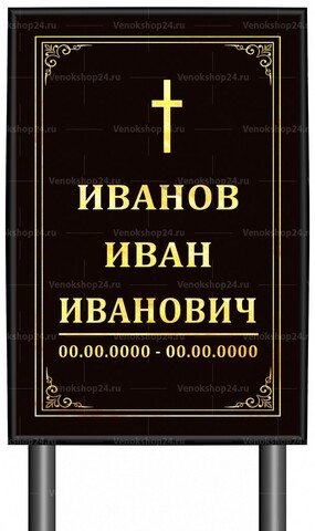 Используется в качестве временного надгробия или как дополнение к кресту. Ножки-трубки втыкаются в землю. Размер без ножек: 60х40 см. Высота ножек 60 см. Строгий траурный дизайн: черный фон и золотые буквы. Над ФИО покойного размещается изображение католического креста. По краям декоративная рамка. Материала выдерживает перепады температур и осадки.