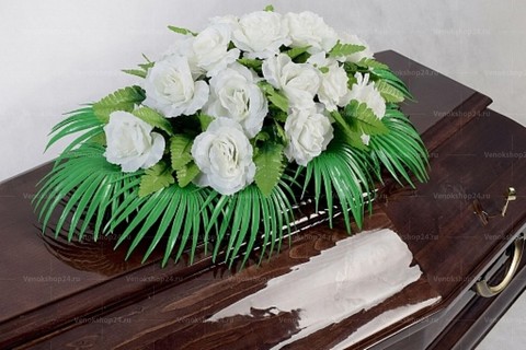 Ритуальная композиция на гроб из искусственных цветов в белой гамме символизирует чистоту и безгрешность. В центре размещены белоснежные розы, дополненные зелеными листьями папоротника и обрамлением в виде разлапистых пальмовых ветвей.