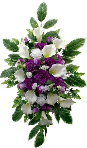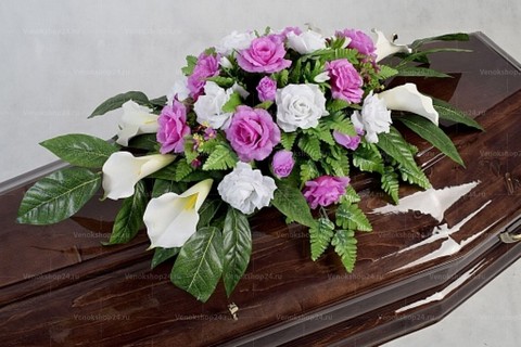 Траурная композиция на гроб из искусственных цветов в бело-фиолетовой гамме. Кипенно-белые каллы олицетворяют чистоту и непорочность. Розы лилового и алебастрового окраса символизируют духовность. В качестве фона выступают листья салала и папоротника.