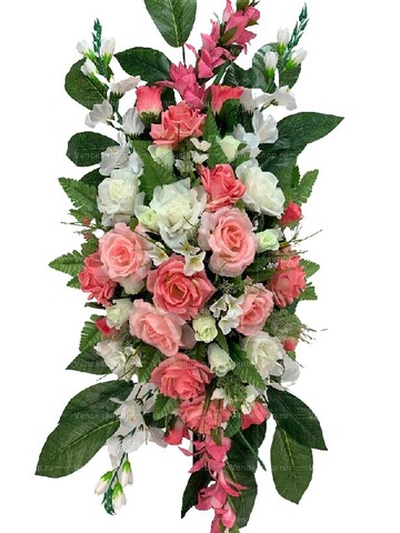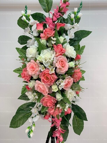 Ритуальная флористическая композиция на крышку гроба выполнена из искусственных роз, гладиолусов и разнообразной зелени. Белые, кремовые, светло-розовые и бледно-лиловые цветы олицетворяют чувства нежной любви к покойному и милосердие.