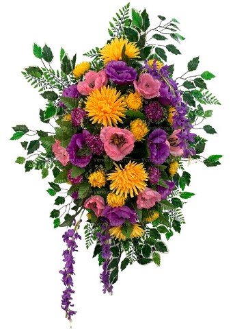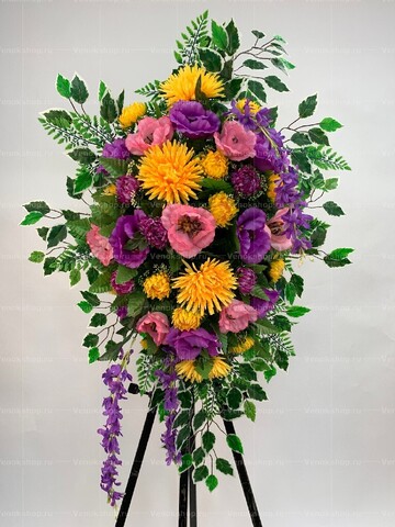 Ритуальная композиция на гроб выполнена в оригинальном цветовом решении и сочетает в себе оттенки фиолетового, розового, охры, зеленого. Цветки шиповника лилового и бледно-лососевого тона, пурпурные хризантемы и сливовые дельфиниумы олицетворяют траурные чувства скорбящего. Пышные янтарные хризантемы привносят нотку света, тепла и надежды.