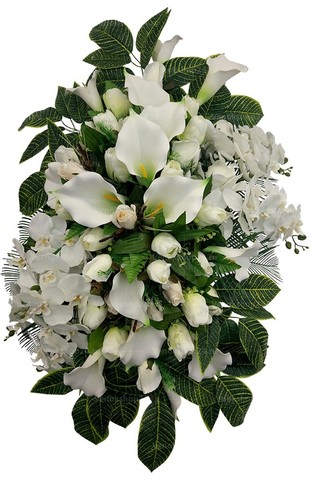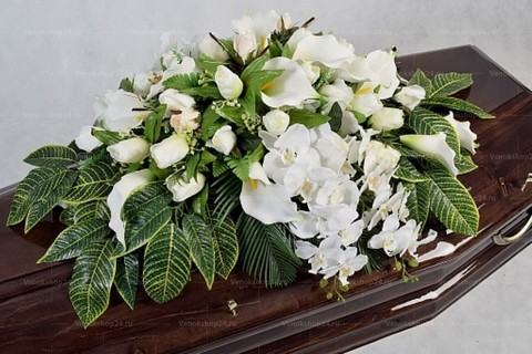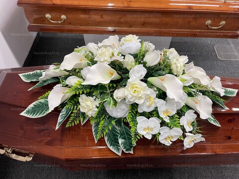 Элегантная ритуальная композиция на гроб из искусственных цветов в белой гамме на фоне темно-малахитовой зелени листьев. Флора представлена белоснежными каллами, алебастровыми орхидеями и бутонами роз молочного оттенка. Эти цветы, символизирующие Райский сад, олицетворяют чистоту и невинность.
