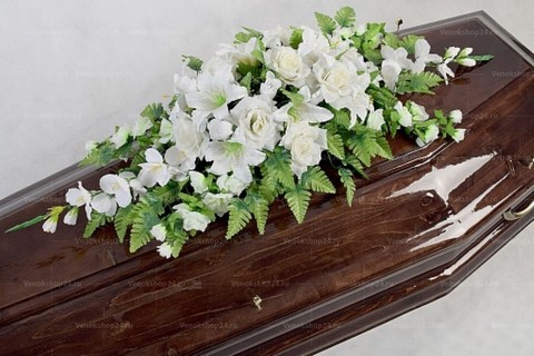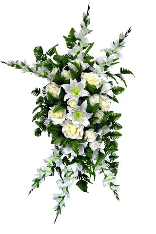 Кипенно-белые лилии и алебастрового колера розы расположились на фоне изумрудной зелени папоротника. Белоснежные соцветия гладиолусов стрелами выходят из центра композиции. Этот ритуальный атрибут в белой цветовой гамме символизирует чистоту, невинность и надежду.