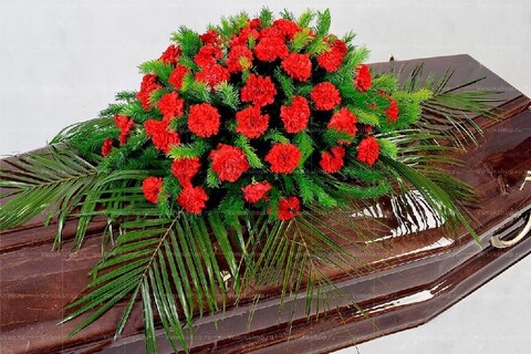 Центр траурной композиции на гроб выполнен в виде полусферы, выложенной красными гвоздиками и хвойными веточками. Эти алые цветы олицетворяют уважение и любовь к покойному, а также являются символом памяти. В качестве фона используются пальмовые ветви.
