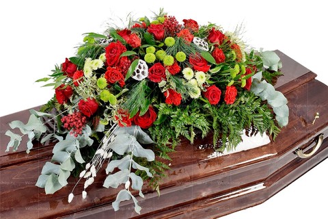 Ритуальная композиция на гроб из ярко-красных роз, багряного колера гвоздик, зеленых и светло-салатовых миниатюрных хризантем. Цветы дополняет разнообразная зелень: папоротник, эвкалипт, хвоя, колосья, а также декор в виде семенных коробочек лотоса. Эта траурная композиция символизирует скоротечность бытия и примиряет с конечностью земной жизни.
