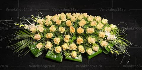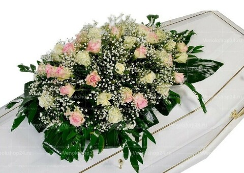 Траурная цветочная композиция составлена из роз светло-розового и кремового оттенка. Изящные бутоны утопают в миниатюрных соцветиях белоснежной гипсофилы. Фон выложен контрастной темно-зеленой листовой. Эти ритуальные цветы способны выразить чувства любви, нежности и сострадания покойному.