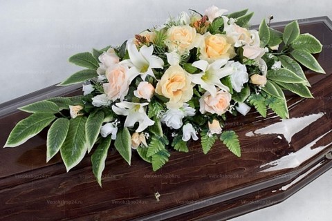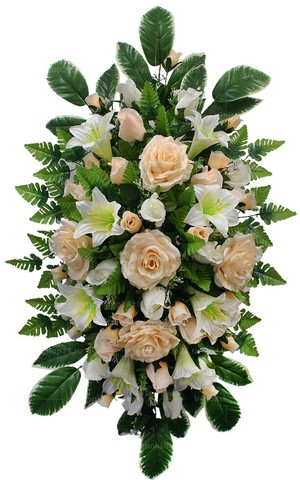 Основу траурной флористической композиции на гроб составляют розы пудрового, кремового и молочного оттенка. Их дополняют белоснежные лилии, а также малахитовая зелень листьев папоротника и салала. Этот изящный ритуальный атрибут способен выразить нежность, сострадание и любовь к усопшему.