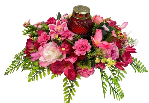 Красивая и трогательная композиция на могилу, собранная из искусственных цветов в пурпурно-розовых тонах. Она является не только украшением могилы, но и символом вашей памяти к ушедшему близкому человеку. Композиция состоит из разнообразных искусственных цветов, которые великолепно сочетаются друг с другом и создают неповторимую атмосферу. Пурпурные и розовые оттенки придают ей нежность и элегантность, что делает ее идеальным выбором для почтения памяти усопшего и украшения места погребения. Композицию можно дополнить лампадой, она приобретается отдельно.