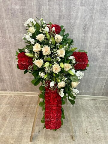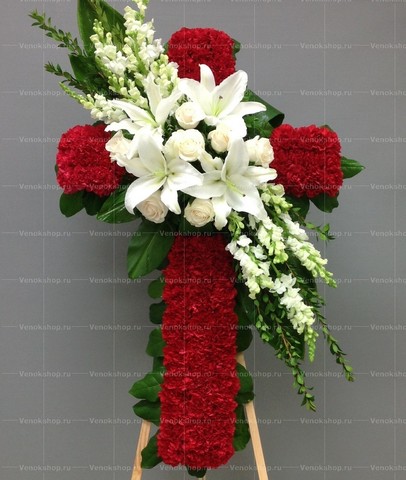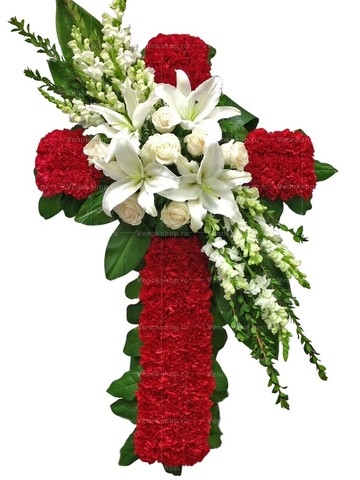 Форма креста составлена из ярко-алых гвоздик. Декоративный элемент, расположенный в центре, изготовлен из цветов в светлых тонах. Крупные алебастровые лилии сочетаются с пудровыми розами и белыми дельфиниумами. Насыщенная зелень листвы дополняет цветы. Крест из живых цветов символизирует очищение от грехов и обретение вечного покоя.