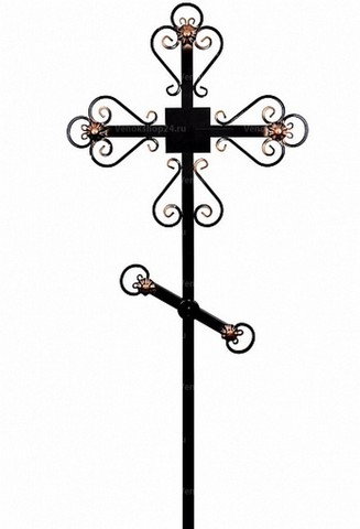 Крест могильный с кованными элементами. Индивидуальность этой модели придают кованные детали с позолотой. На кресте имеется табличка для информации об усопшем. Крест окрашен стойкой к атмосферным воздействиям краской черного цвета. Высота 210 см.
