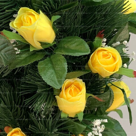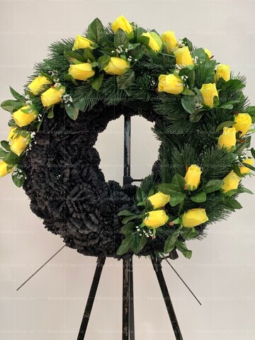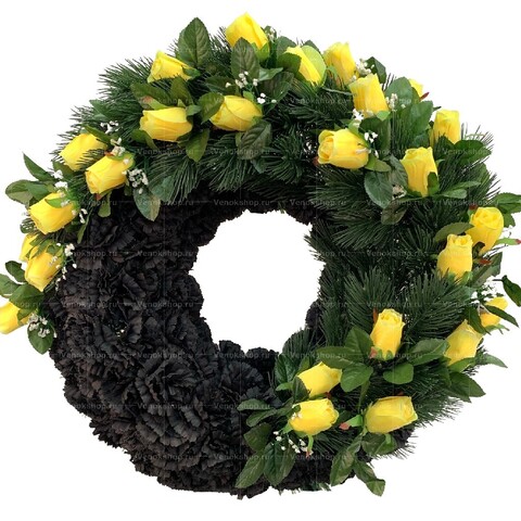 Ритуальный круглый венок выполнен из черных траурных гвоздик. Эти цветы, полные трагизма, выложены фоном. Канареечно-желтые бутоны роз, дополненные зеленью листвы и еловыми веточками, привносят элемент надежды, олицетворяя солнечный свет и душевное тепло.
