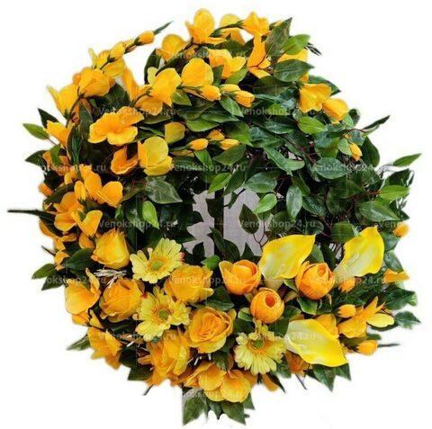 Ритуальная флористическая композиция на похороны выполнена в форме круглого венка. Цветовая гамма представляет собой сочетание цветов в оттенках желтого, олицетворяющих тепло солнечного света, чувства любви и уважения к покойному. Палевые герберы, лимонного окраса каллы, шафрановые розы, янтарно-желтые соцветия дельфиниума выгодно оттенены фоновой зеленью листвы.