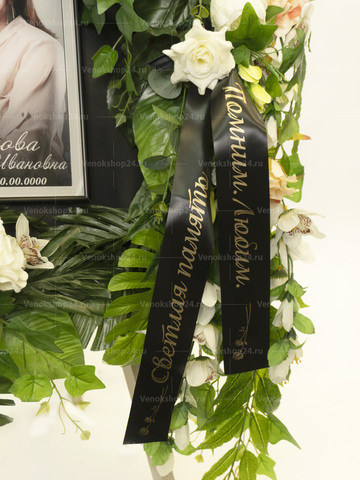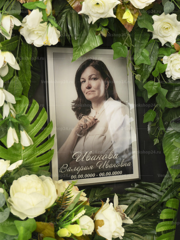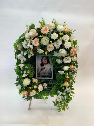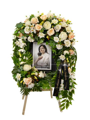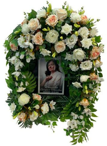 Рамка-круг изготовлена из красивых цветов, таких как розы, пионы, орхидеи, а также зелени, которая придает ей еще больше живости и свежести. Она подходит для установки портрета покойного, чтобы отдать ему последний долг и уважение. Изготовленная из качественных цветов, композиция обладает долгим сроком службы, сохраняя свою свежесть и яркость на протяжении длительного времени. Она также является легкой и удобной в установке, что позволит вам без труда разместить ее на подходящем месте во время церемонии. Поставляется без портрета.