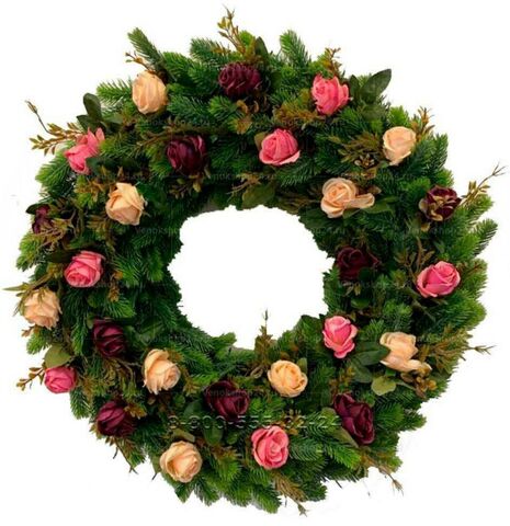 Траурная композиция выполнена в европейской традиции и представляет собой венок круглой формы. Основа выложена еловыми ветками, на фоне которых расположилась россыпь бордовых, персиковых и розовых роз. Композиция символизирует боль невосполнимой утраты скорбящего.
