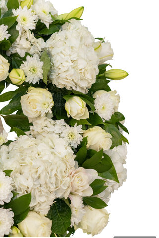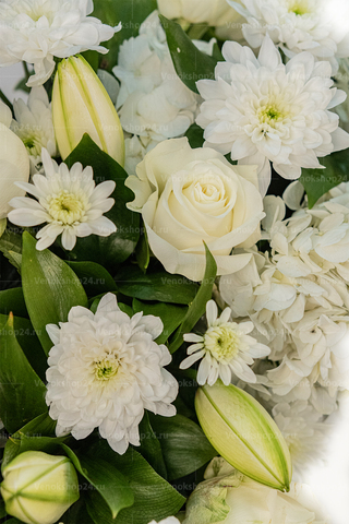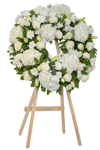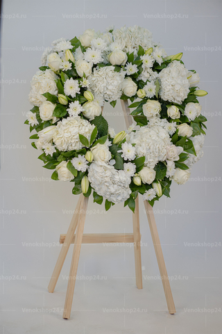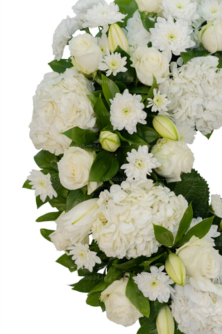 Траурный венок из живых цветов в форме кольца. Композиция представляет собой сочетание белоснежных лилий, пышных соцветий гортензии молочного оттенка и алебастровых бутонов роз на фоне яркой зелени листьев. Цветы в белой гамме символизируют чистоту и способны выразить светлые чувства любви к усопшему.