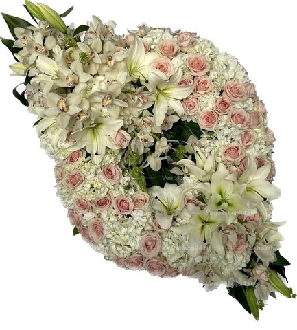 Круглый траурный венок составлен из пышных белых гортензий и нежно-розовых бутонов роз. В верхней части разместились белоснежные орхидеи, а в нижней — алебастровые лилии. Эта композиция символизирует небесную чистоту и подлинную любовь.