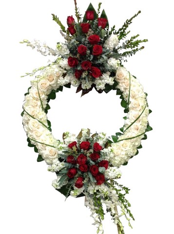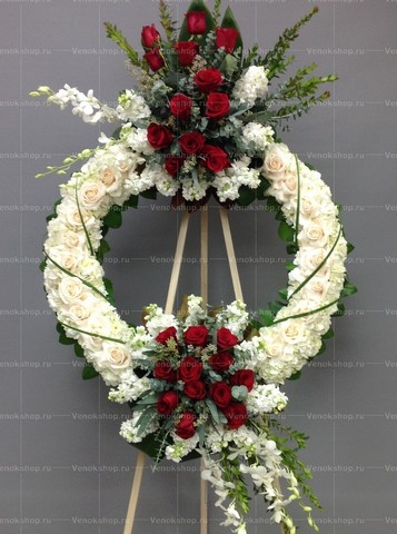 Венок из живых цветов на похороны выложен белыми гортензиями, между которыми разместился ряд пудровых роз. Верх и низ круга увенчан бордовыми розами в сочетании с алебастровыми соцветиями дельфиниума и изумрудной зеленью. Эта композиция символизирует скорбь и вечную память, но вместе с тем олицетворяет надежду.