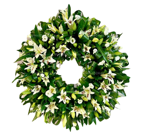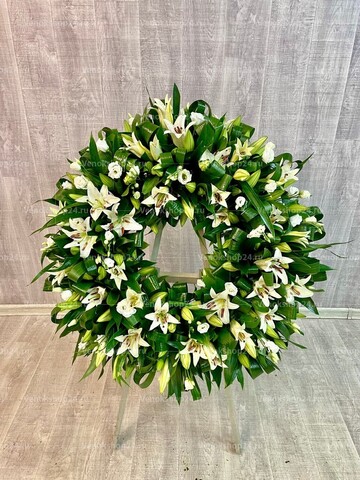 Траурный венок из живых цветов выполнен в форме круглого кольца из бутонов и соцветий белоснежной лилии. Белый цвет композиции и цветы лилий символизируют обретение покоя в ином мире, Райский сад и умиротворение.