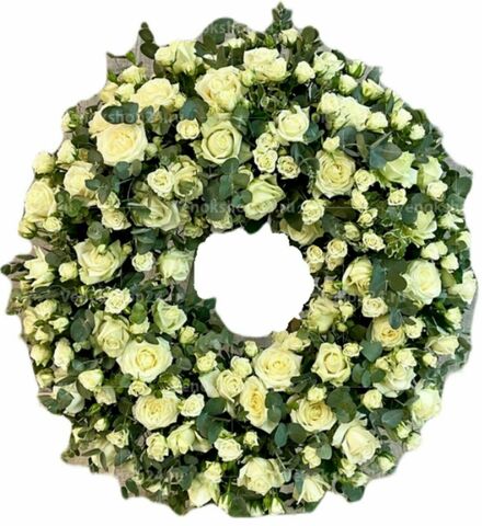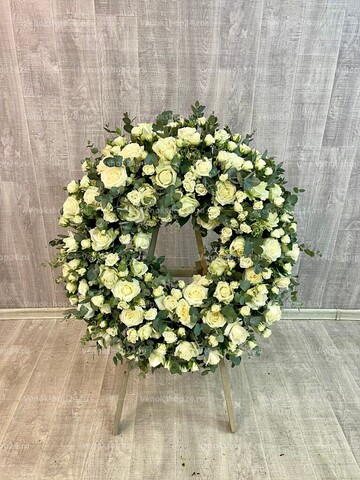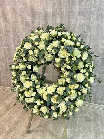 Ритуальный венок из живых цветов, в сочетании роз нежно-белого цвета, эвкалипта и вкрапления кустовой белой розы, собран в виде круга. Композиция олицетворяет вечную любовь, тленность бытия, скорбь и память, которая останется в сердцах навеки.