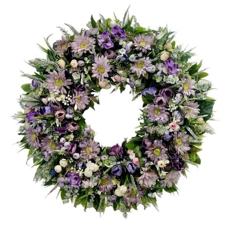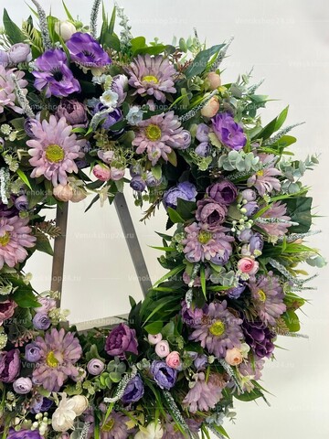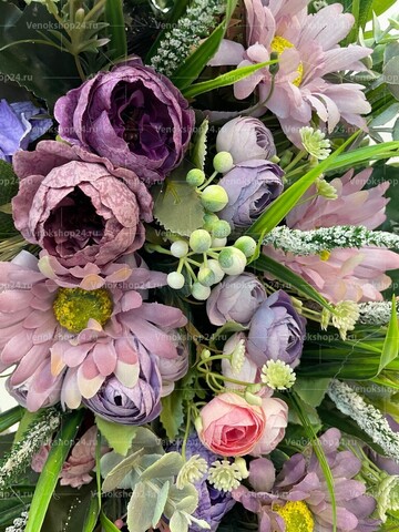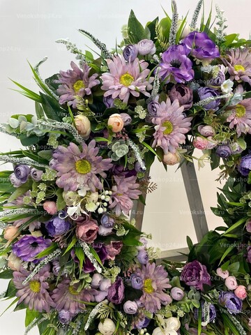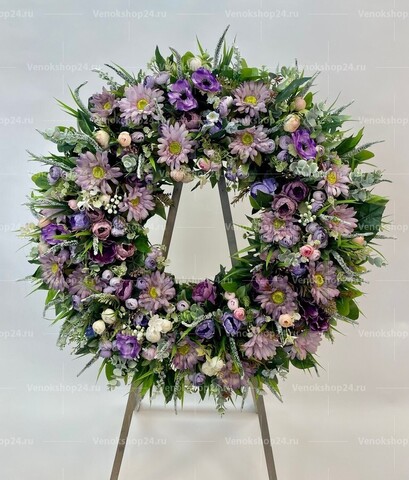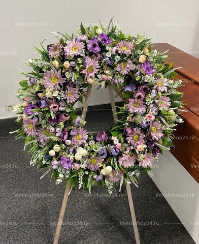 Траурная композиция круглой формы выполнена из россыпи цветов в нежно-фиолетовых тонах. Круг выложен лиловыми герберами, камелиями, дополнен розовыми бутонами роз и множеством других декоративных цветов и зелени. Ритуальная композиция символизирует душевное тепло, глубокое сожаление о невосполнимой утрате и бессмертие вечной души