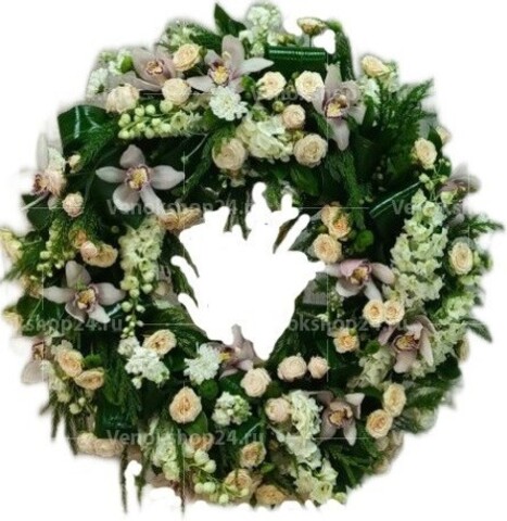 Ритуальный венок из живых цветов собран в виде круга. Композиция олицетворяет вечную любовь, тленность бытия, скорбь и память, которая останется в сердцах навеки.