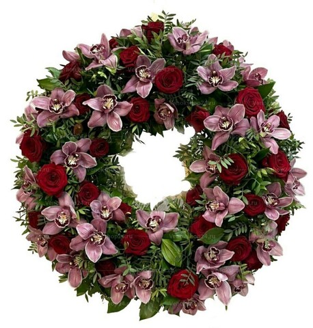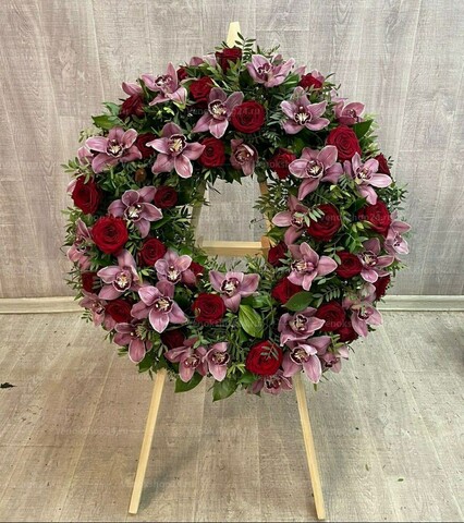 Ритуальный венок из живых цветов, в сочетании роз темно-красного цвета, орхидеи, собран в виде круга. Композиция олицетворяет вечную любовь, тленность бытия, скорбь и память, которая останется в сердцах навеки.