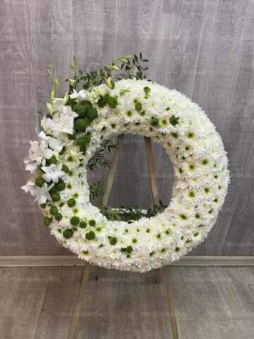 Венок из живых цветов в форме круга. Основа выложена хризантемами кремового и зеленого оттенка, олицетворяющими надежду на вечную жизнь. Белоснежные орхидеи разместились слева и символизируют небесную чистоту. Декоративная зелень подчеркивает трепетность цветов.