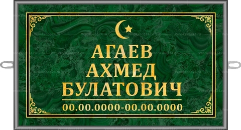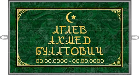 Табличка на памятник с исламской символикой. Размер: 30х18 см. Надпись черными буквами на зеленом фоне и в обрамлении рамки. Сверху изображение полумесяца со звездой. Изготовлена из прочного и долговечного материала.