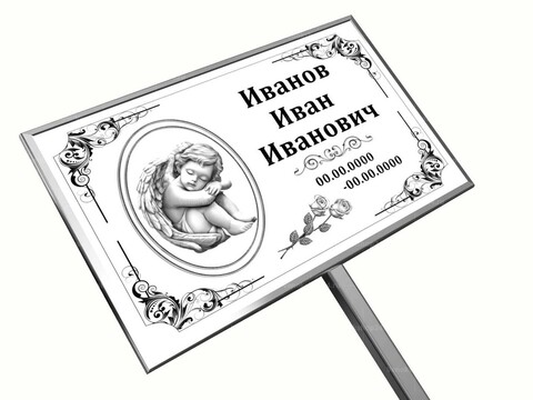 Ритуальная табличка на могилу с православной символикой. Размер: 30х18 см. Текст черного цвета на сером фоне. Над фамилией, именем и отчеством усопшего нанесено изображение православного креста и надпись “Вечная память”. Под чертой указаны годы жизни арабскими цифрами в формате ДД.ММ.ГГГГ-ДД.ММ.ГГГГ. Изготовлена из прочного влагостойкого материала.