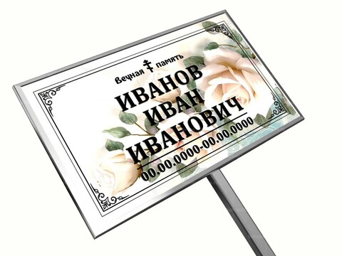 Ритуальная табличка на могилу с православной символикой. Размер: 30х18 см. Текст черного цвета на сером фоне. Над фамилией, именем и отчеством усопшего нанесено изображение православного креста и надпись “Вечная память”. Под чертой указаны годы жизни арабскими цифрами в формате ДД.ММ.ГГГГ-ДД.ММ.ГГГГ. Изготовлена из прочного влагостойкого материала.